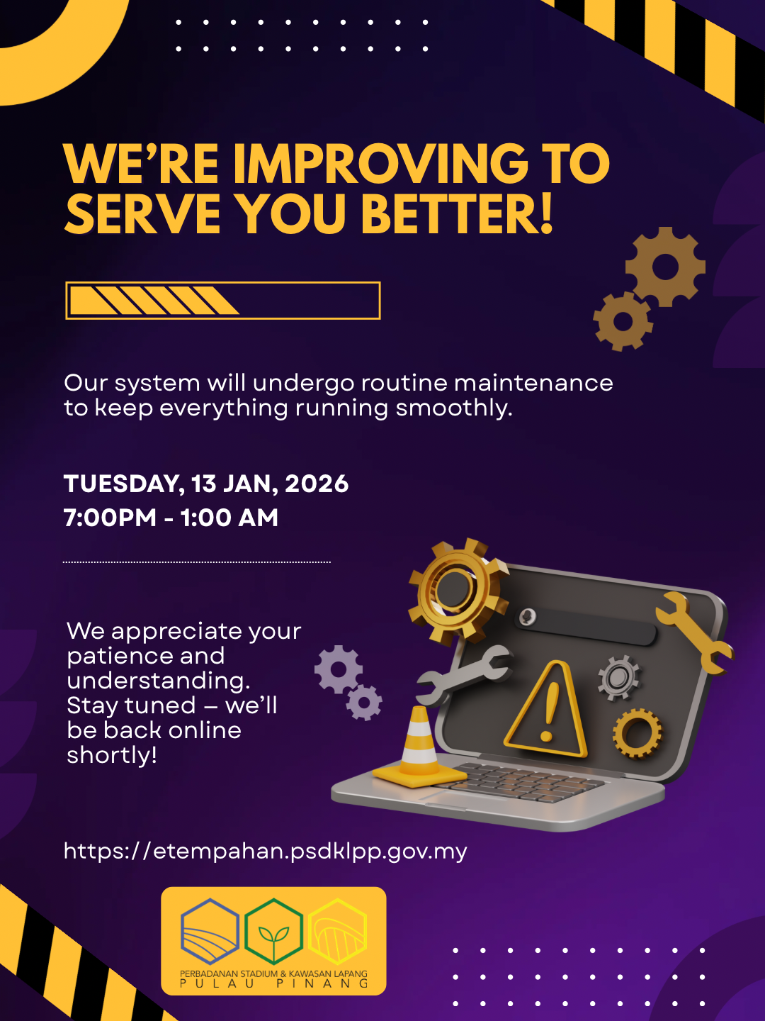Dengan hormatnya dimaklumkan bahawa penyelenggaraan berjadual laman web kami akan dilaksanakan pada 13 Januari 2026, dari 7.00 malam hingga 1.00 pagi. Akses ke laman web mungkin terganggu sepanjang tempoh tersebut. Segala kesulitan amatlah dikesali. PSDKLPP